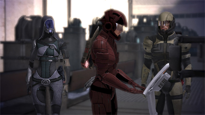 Det är meningen att jag ska rädda galaxen, typ. Den vanliga sci-fi-plotten, ni vet. Måttligt intressant till en början, men man märker rätt snart att BioWare har mer att ge. Handlingen utvecklas till en komplicerad och välskriven historia som berättas med sådan inlevelse av de redigt duktiga röstskådespelarna att jag faller pladask. Hela världen som BioWare bygger upp känns trovärdig och jag börjar känna för de många karaktärerna i spelet, och behandlar dem därefter - vissa får sig en avhyvling och vissa får ett honungslent bemötande...
